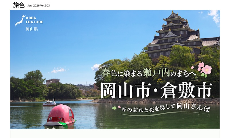 今回の連載「エリアフィーチャー」は、2本立て。まち歩きの楽しい観光地として名高い埼玉県 川越市は、あまり知られていない夜ならではの楽しみをピックアップ。岡山県 岡山市・倉敷市の特集では、瀬戸内の味覚や由緒ある寺社など、気持ちが晴れやかになる春の旅を提案します。