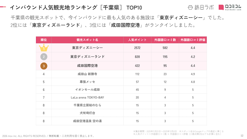 業界最大級のインバウンドビジネスメディア「訪日ラボ」及び 店舗向け集客一元化プラットフォーム「口コミコム」を運営する株式会社movは、千葉県の観光地に寄せられた最新の口コミデータから、独自の『インバウンド人気観光地ランキング』を発表しました。