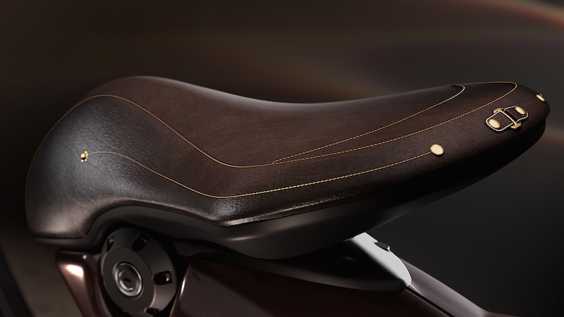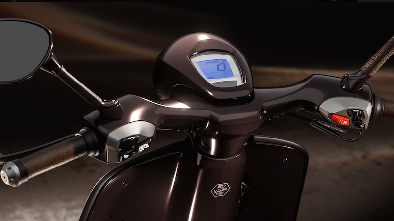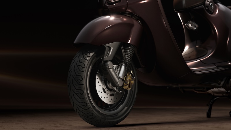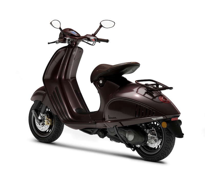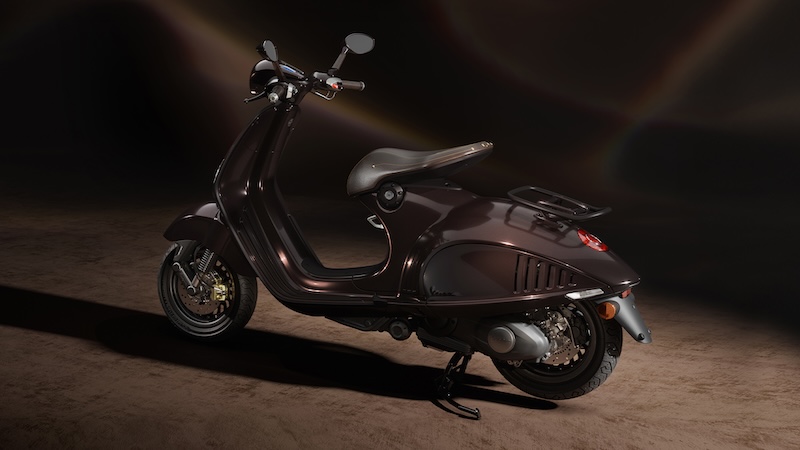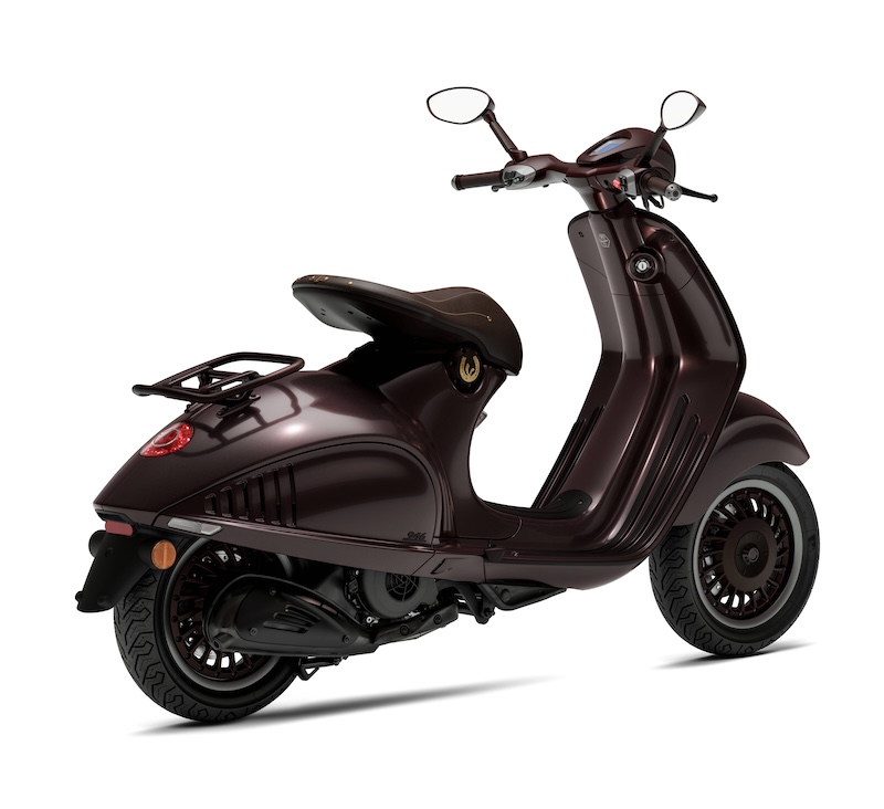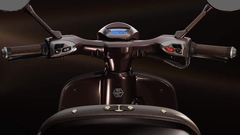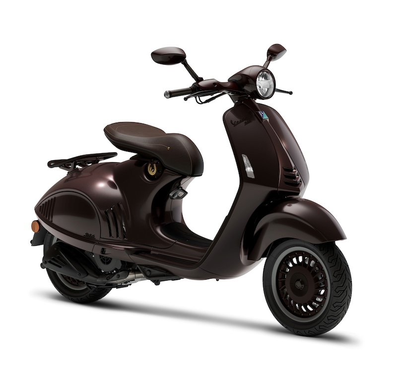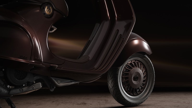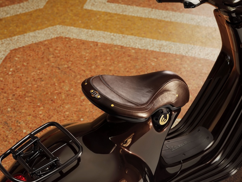 このモデルのボディカラーは、馬の光沢のある濃い栗毛色を彷彿とさせる深みのあるペイントが特徴で、マットとグロス仕上げのコントラスト、そしてシート下にはVespaの「V」を囲む金色の蹄鉄をあしらった象徴的なディテールが施されなど、洗練されたゴールドのディテールを巧みに取り入れ、乗馬用の鞍を思わせる革製のシートに加え、上質なレザーを巻いたハンドルバーグリップとミラーステムなど、イタリアの卓越した職人技が新しい Vespa 946 に優雅さと個性が融合しています。