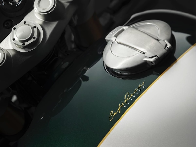 精緻に施されたエンパイア・ゴールドのコーチラインがカラーの切り替わりを美しく際立たせ、クラフトマンシップを感じさせるプレミアムなディテールを添えています。タンクには同じくエンパイア・ゴールドで描かれた「Cafe Racer Edition」のグラフィックを配し、確かなエクスクルーシビティを表現。このツートーンのテーマはシートカウルにも継承され、コンペティション・グリーンを基調に、アルミニウム・シルバーのアクセントをプラス。タンクと呼応するエンパイア・ゴールドのコーチラインが、フロントからリアへと視覚的な一体感をもたらします。