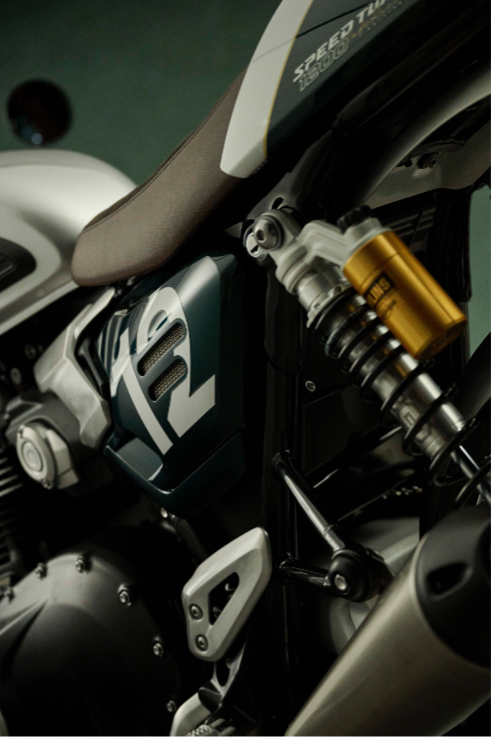よりダイナミックで没入感のあるライディングを求めるライダーに向けて、「Speed Twin 1200 Cafe Racer Edition」は、低く構えたクリップオンハンドルによる、いっそう研ぎ澄まされたライディングポジションを採用しています。Speed Twin 1200 RS同様、その俊敏なキャラクターを支えるのはトップスペックのサスペンション。フルアジャスタブルのマルゾッキ製フロントフォークに、オーリンズ製リアサスペンションを組み合わせています。