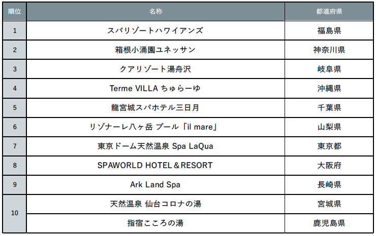 寒さが一段と厳しくなるこの季節、心も体もほっと温まる温泉やスパが恋しくなる頃ではないでしょうか。今回は、温泉とプールが両方あったり、岩盤浴やさまざまなお風呂が楽しめたりする館内施設充実の“一日遊べる温泉テーマパーク”についてアンケート調査を実施しました。第1位に選ばれたのは、福島県「スパリゾートハワイアンズ」。6つのテーマパークを備えた全天候型のエンターテインメント施設で、年中常夏!いつでもハワイ気分を味わえます。第2位には、神奈川県「箱根小涌園ユネッサン」がランクイン。箱根の温泉を気軽に楽しめる温泉アミューズメントパークで、ユニークなお風呂や一年中遊べるプールも魅力です。そのほか、旅行情報サイト『じゃらんニュース』では、TOP10以外にもおすすめの温泉テーマパークを厳選して紹介しています。(温泉テーマパーク:https://www.jalan.net/news/article/180729/
