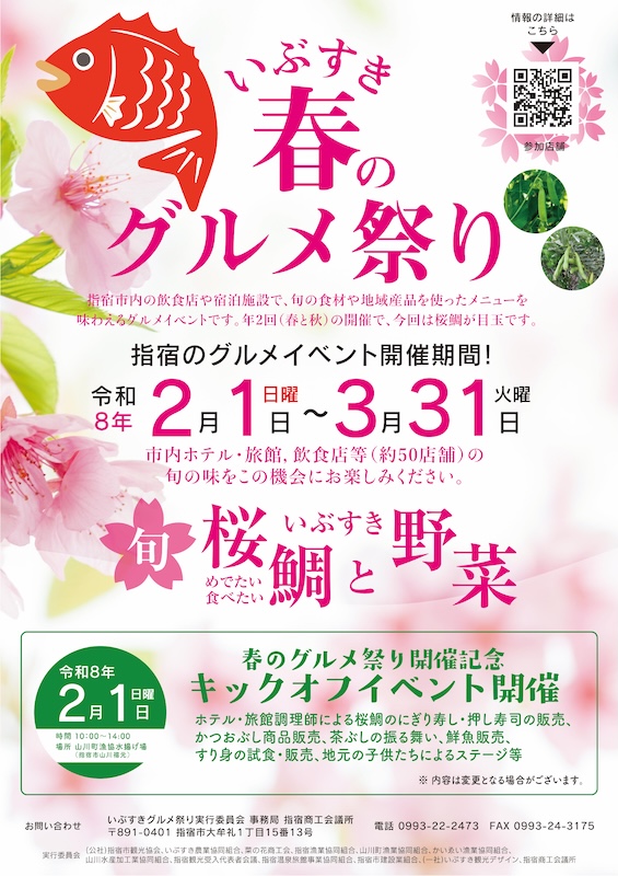 2026 年2 月1 日(日)~3 月31 日(火)の期間中、指宿の旬の素材を集めて参加各店が腕を振るう『いぶすき春のグルメ祭り ~桜鯛といぶすき野菜』が開催されます!