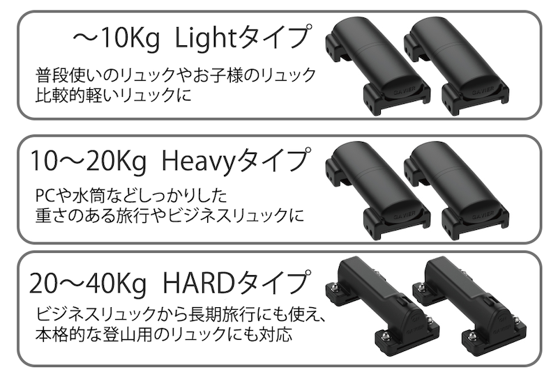 本製品は、リュックの荷重によりラインナップしており、この度はより重量の重いリュックに対応したHARDを発売致します。