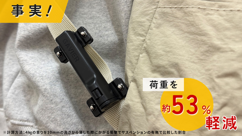 車のサスペンションと同様の効果で急激な力を緩和し、結果的に重量が軽くなったかのような印象になります。
