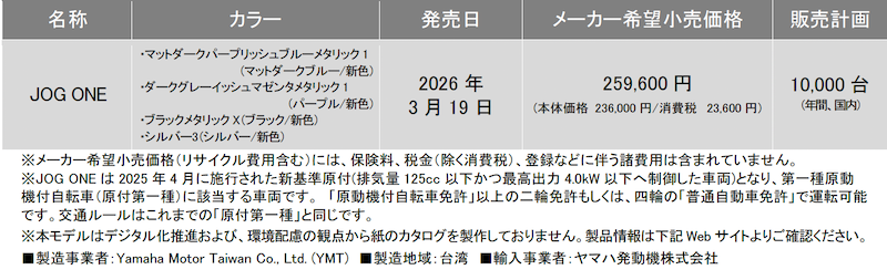 ヤマハ発動機販売株式会社は、原付一種(第一種原動機付自転車)に新たに追加された区分基準(以下、新基準原付※1)に適合したスクーターの新製品「JOG ONE(ジョグ ワン)」を3月19日に発売します。