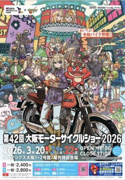 一般社団法人 日本二輪車普及安全協会が主催する2026年3月開催の『第42回大阪モーターサイクルショー2026』ならびに『第53回東京モーターサイクルショー2026』について、両モーターサイクルショーの連動を強化する目的で、前回より共通テーマを設定、今回もメインテーマとして「いいね、バイク」といたしました。 さらに、地域特性を際立たせるため、サブテーマを設け、大阪は、『おいでよ、令和バイク界隈』、東京は、『「好き」を極めろ』とし、二輪車に興味関心のあるベテラン層から、若年エントリーのビギナー層まで楽しめる豊富なイベントコンテンツを企画し、実施いたします。 さらに、両モーターサイクルショーの連動強化とともに、若年層へのアプローチを積極的に図るため、(株)MIXIが提供する大人気スマホアプリゲーム『モンスターストライク』(モンスト)とのコラボレーション施策を実施することが決定いたしました。