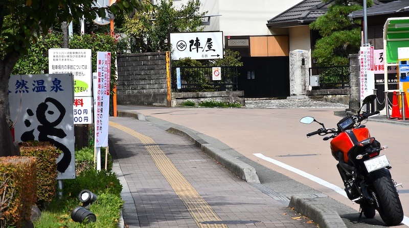バイクは狭いながらも奥の駐輪用に停めることができます。お風呂は内湯と露天風呂があり、サウナや食事処もあります。