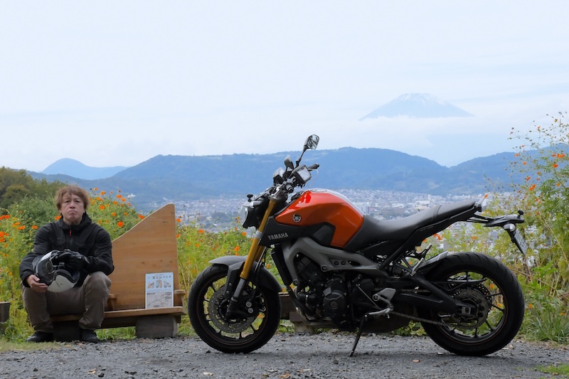 駐車場から数百m歩くと展望台があり富士山の眺望を望むことができますが、お勧めは同公園の北側の車道沿い にある弘法山展望所。ここからも富士山の好眺望を望めて、しかもバイクを絡めることができるのが嬉しいです。