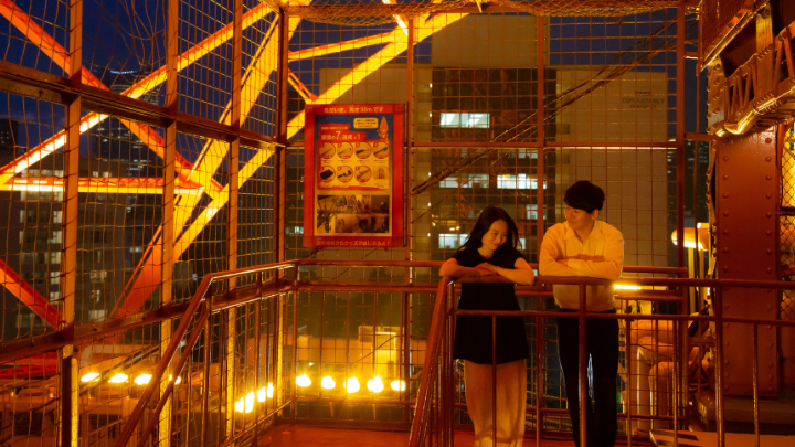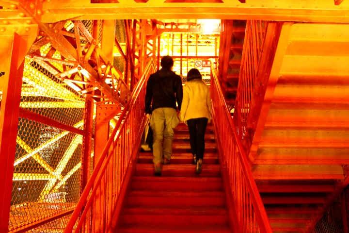 夜のオープンエア外階段コースの醍醐味はなんといっても、夜景を眺めつつ、ライトアップに浮かび上がる「鉄骨」の中を昇っていく感覚を味わえること。