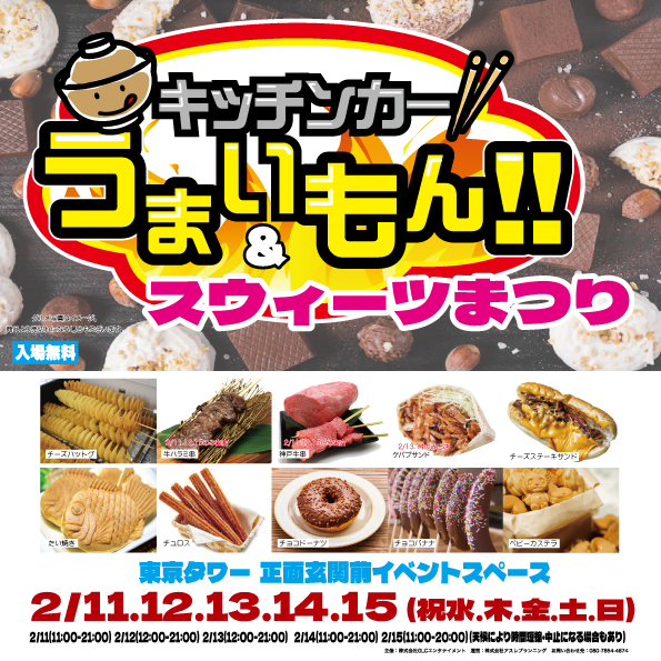 人気のキッチンカーが東京タワー正面に集結し、自慢のうまいもんを販売します。総勢20種類以上の人気グルメに加え、バレンタインにちなんだチョコグルメも限定販売!東京タワーの真下で、「うまいもん」を堪能してください!