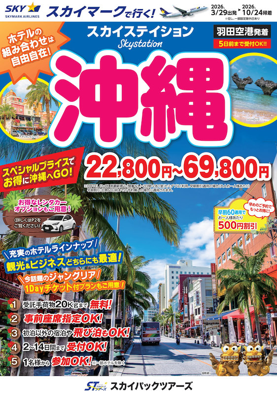 スカイパックツアーズ株式会社は、スカイマークを利用した価格固定型のパンフレット旅行商品「スカイステイション 沖縄」【羽田空港発着】(2026年3月29日出発~2026年10月24日帰着)の販売を開始します。スカイマークだけを取り扱う専売店だからできるスペシャルプライス!早めのご予約がお得です。