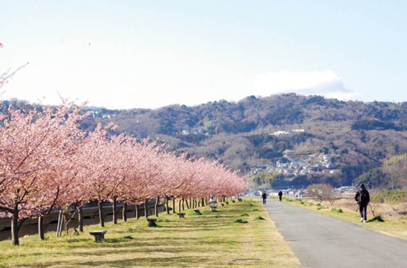 早咲きの河津桜が約400mにわたり並ぶ絶景スポット。桃色に染まる桜並木は、春を先取りできる風景として人気です。ゆったり散策はもちろん、サイクリングで川沿いを走るのもおすすめ。河津桜ならではの濃いピンク色が青空に映え、写真映えする美しい景観が魅力です。