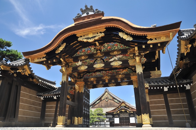 1603年、徳川家康が京都御所の守護と将軍上洛の際の宿泊所とするため築城。3代将軍家光の時代、後水尾天皇行幸(寛永行幸)のために大規模な改修が行われ、二の丸御殿にも狩野探幽の障壁画などが加えられました。1867年には15代将軍慶喜が二の丸御殿で「大政奉還」の意思を表明するなど、数々の歴史の舞台となりました。1994年、ユネスコ世界文化遺産に登録。