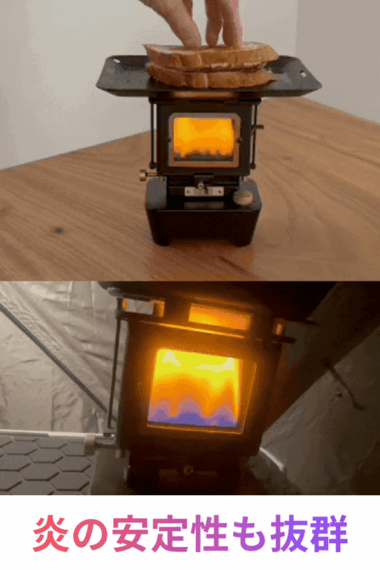 クリーン燃焼:煙・煤をほぼ出さない燃焼で、室内やテント内でも使用可能
