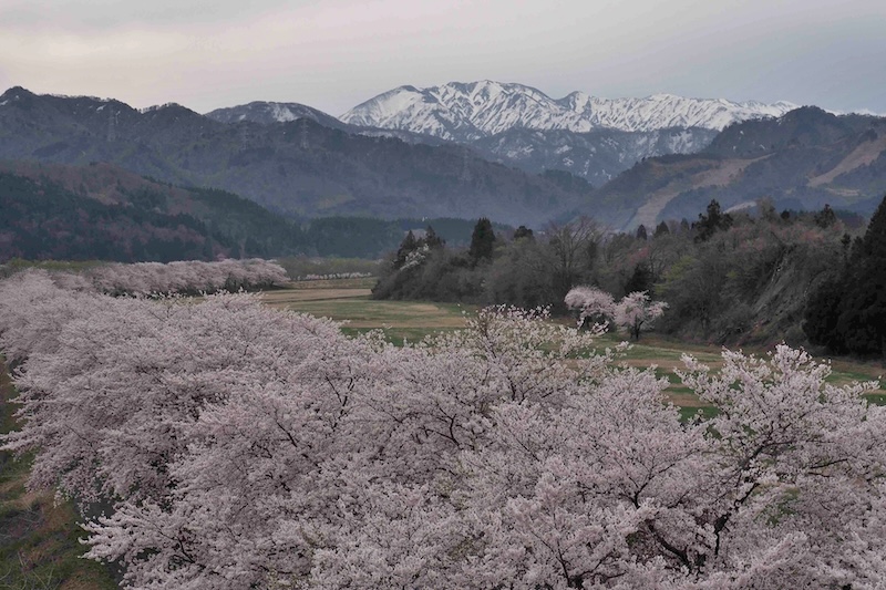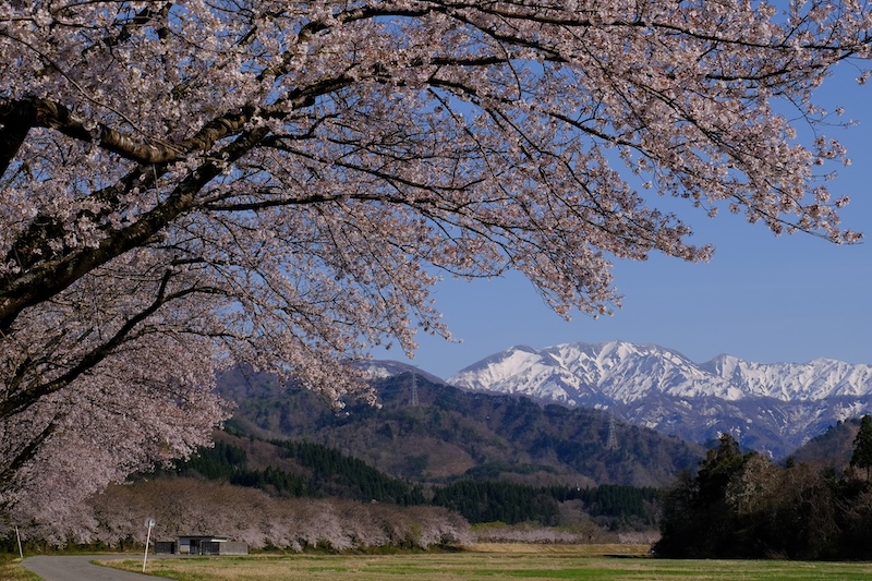飯豊連峰を源とする胎内川上流部、夏井河川敷の両岸には、約1kmにわたる染井吉野の桜並木が続きます。この道は、地域の人々にとって長く“季節の合図”であり、同時に“帰ってきたくなる風景”として大切に守られてきました。