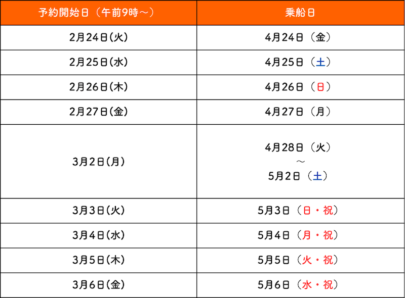 ゴールデンウィーク乗船予約受付開始日