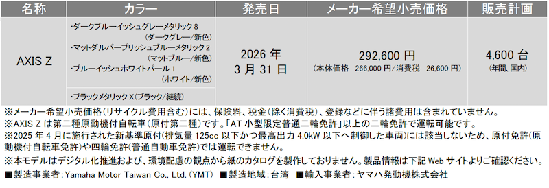ヤマハ発動機販売株式会社は、“BLUE CORE※1”エンジンを搭載する原付二種スクーター「AXIS Z(アクシス ゼット)」の新色を3月31日に発売します。