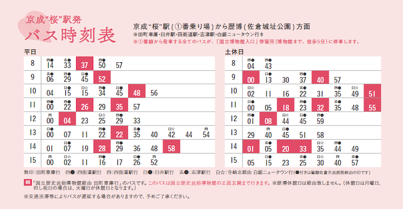 ①京成”桜”駅南口→国立歴史民俗博物館(※佐倉城址公園最寄り)