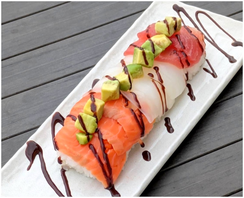 サーモン、いか、鮪のお寿司にチョコソースをかけ、アクセントにアボカドを添えました。