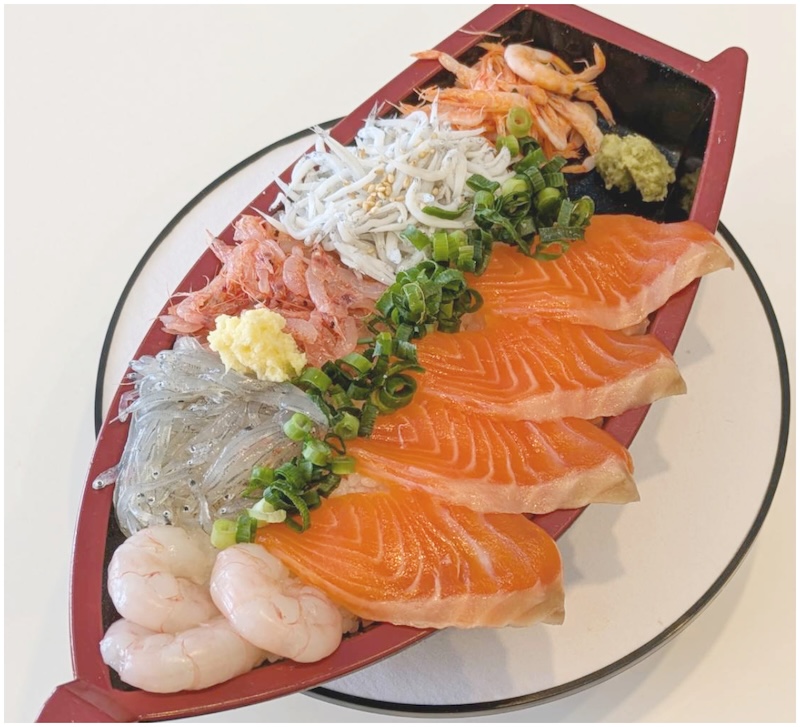 富士山の伏流水で育ったブランドサーモン「富士山サーモン」と、静岡を代表する海の仲間たちを一人前の船盛に盛り付けた丼ぶりです。提供時には回転台に乗せてご提供し、視覚でも楽しめる一品です。