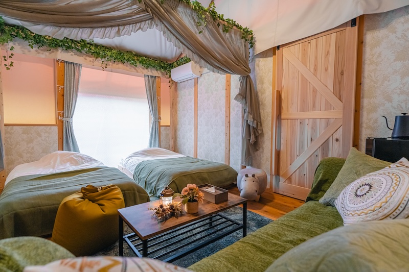 木々に囲まれたプライベート感のあるサイトで、グランピングテントや一棟貸しコテージを選んで滞在。