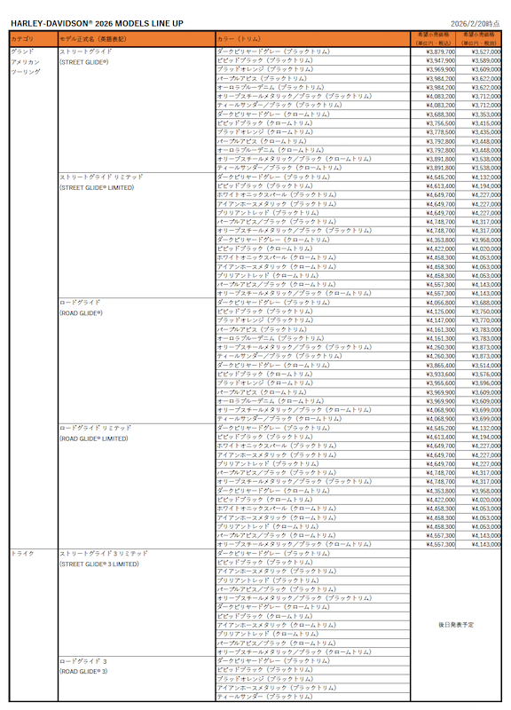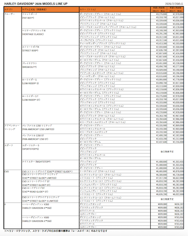 ハーレーダビッドソン(HARLEY-DAVIDSON®)は2026 年モデル23 車種の日本仕様を発表いたしました。後日価格を発表する予定の一部モデルを除き、下記の19 モデルは本日から正規ディーラー各店にて販売いたします。発売する各モデルの納車デリバリーは、2026 年3 月から順次実施いたします。