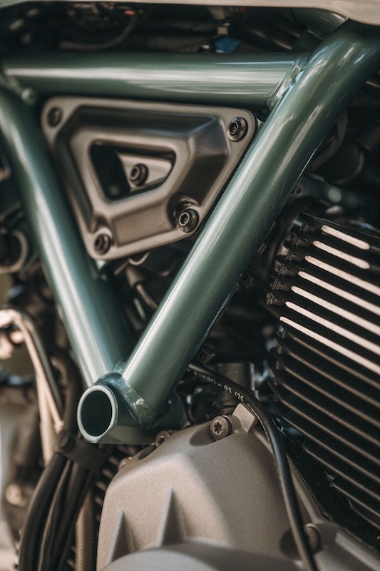 Formula 73のスチール製トレリスフレームは、そのインスピレーションの源であるSuper Sport Desmoとのつながりをより強く印象づけています。スリムなフォルムにアクアグリーンの塗装が施されたフレームは、リバリーの一部としてデザインに溶け込みます。さらに、17インチのスポークホイールにピレリ製ディアブロ・ロッソ4タイヤを組み合わせることで、優れた操縦性と乗りやすさを実現しています。