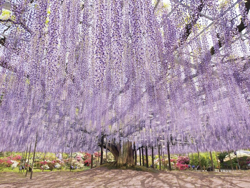 足利市の「あしかがフラワーパーク」は、CNNから「世界の夢の旅行先」に選ばれたこともある、世界基準の春絶景で知られる場所です。なかでも樹齢160年を超える大藤の棚は圧巻で、約600畳もの広さに広がります。夜のライトアップでは、紫の花が雨のように降り注ぐ幻想的な光景が広がります。