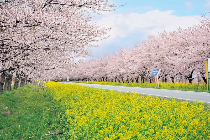 かつて日本で二番目の広さを誇った湖・八郎潟を干拓して生まれた大潟村。広大な土地を活かした「桜・菜の花ロード」は、ほかにはないスケールで訪れる人を圧倒します。直線道路に沿って約11km、約4,000本の桜と一面の菜の花、さらに黒松が織りなすコントラストがどこまでも続き、日本にいることを忘れてしまうような風景が広がります。