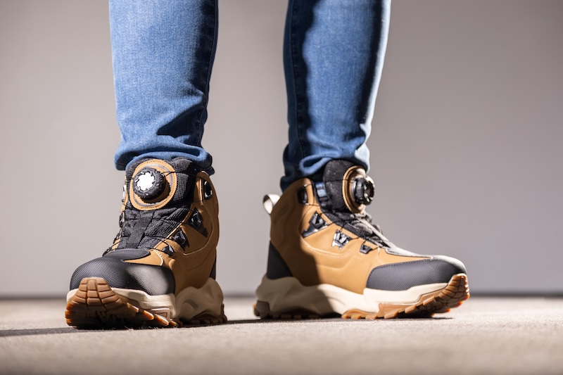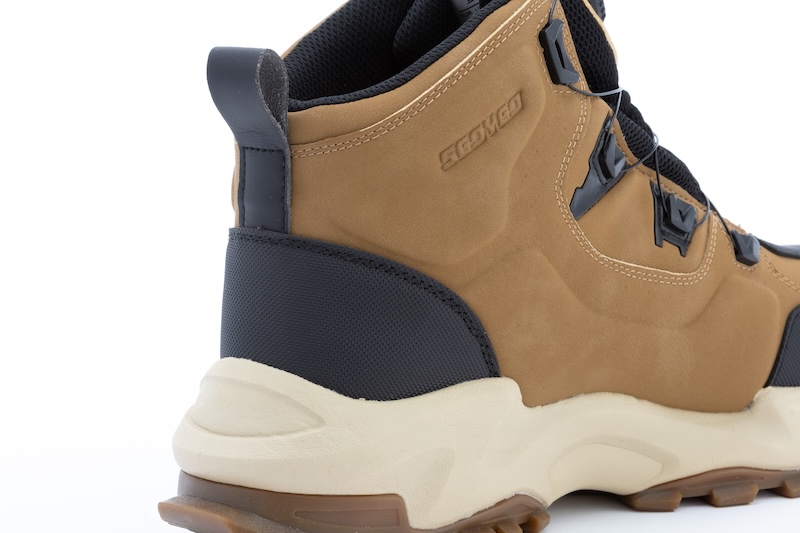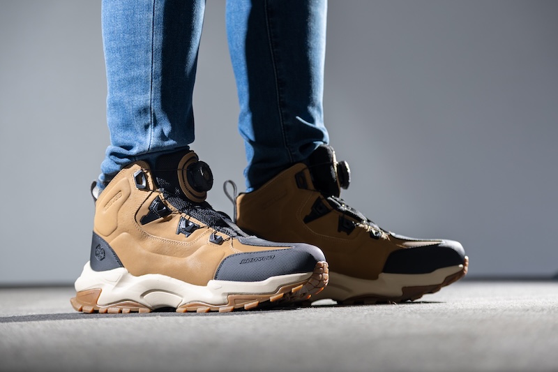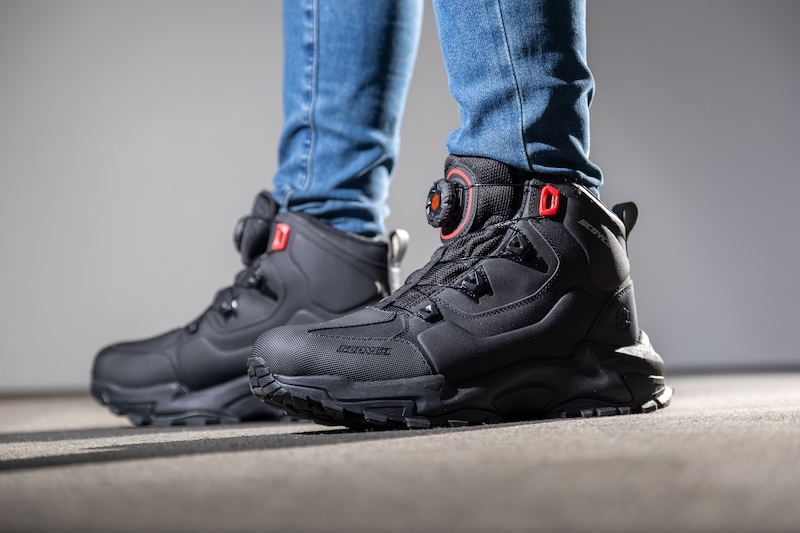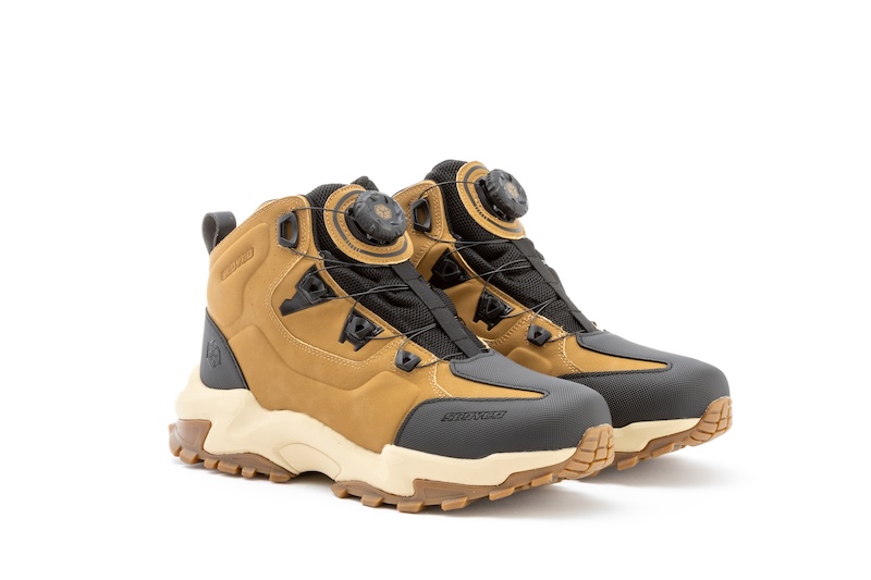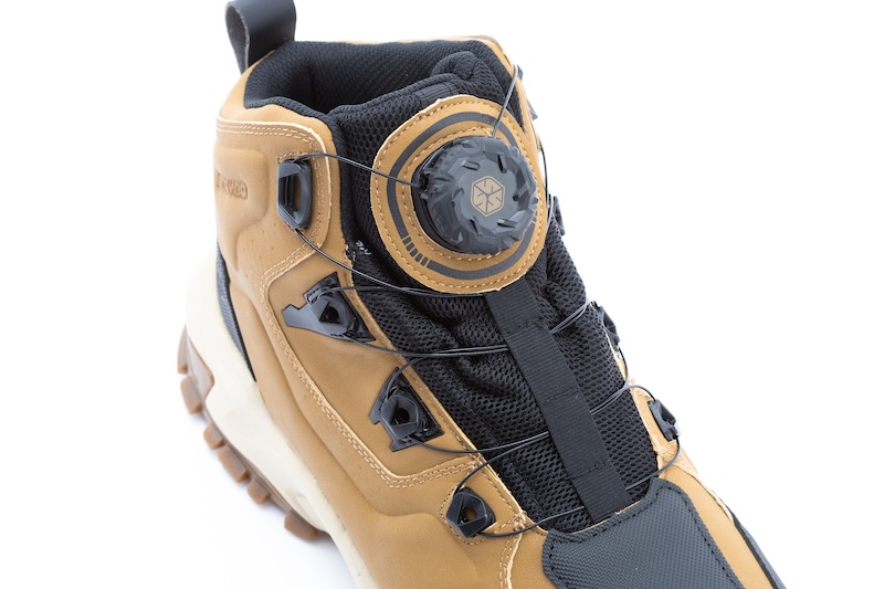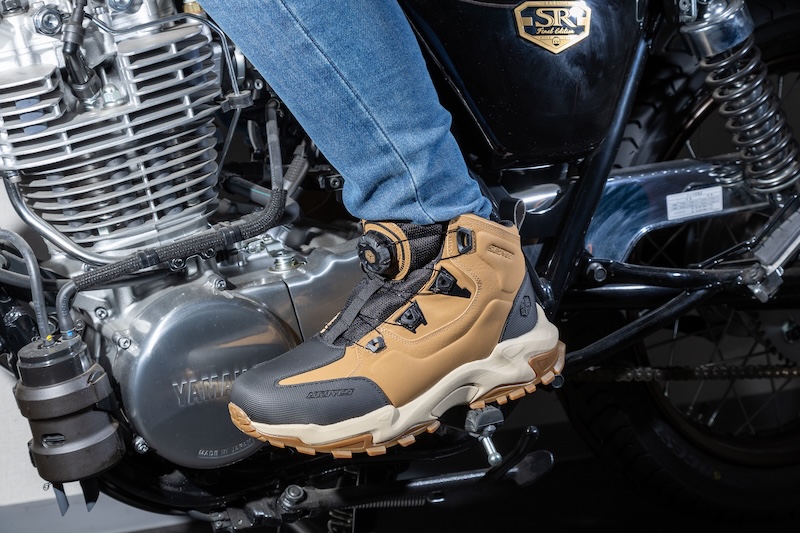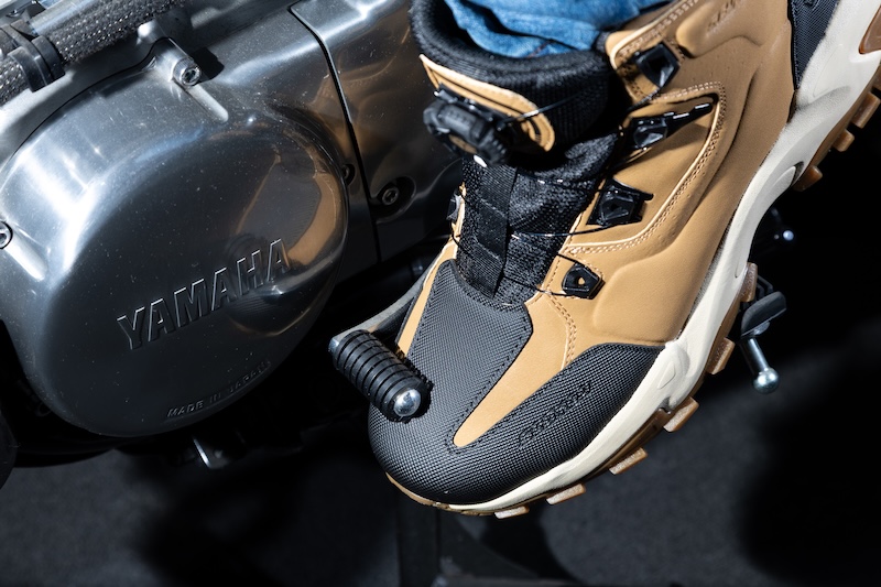 まるで軽登山やキャンプ向けのトレッキングシューズのようなスタイルは、従来のライディングシューズには見られない特徴です。