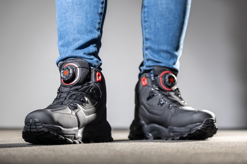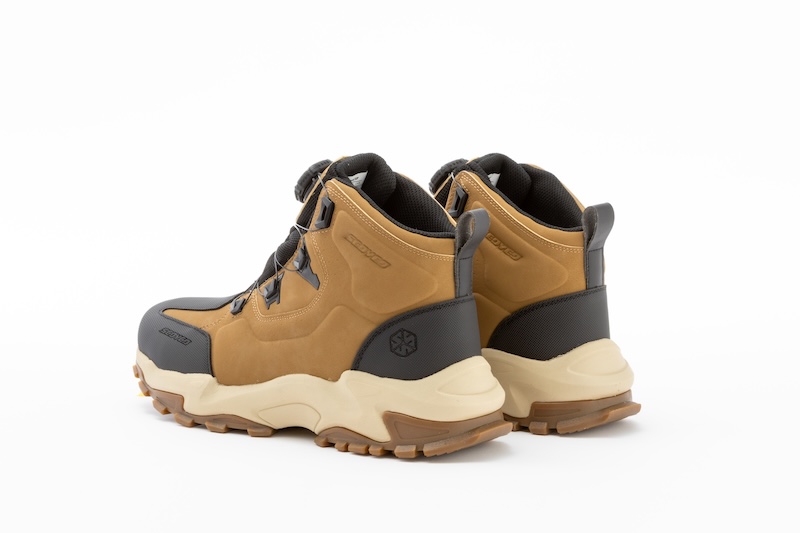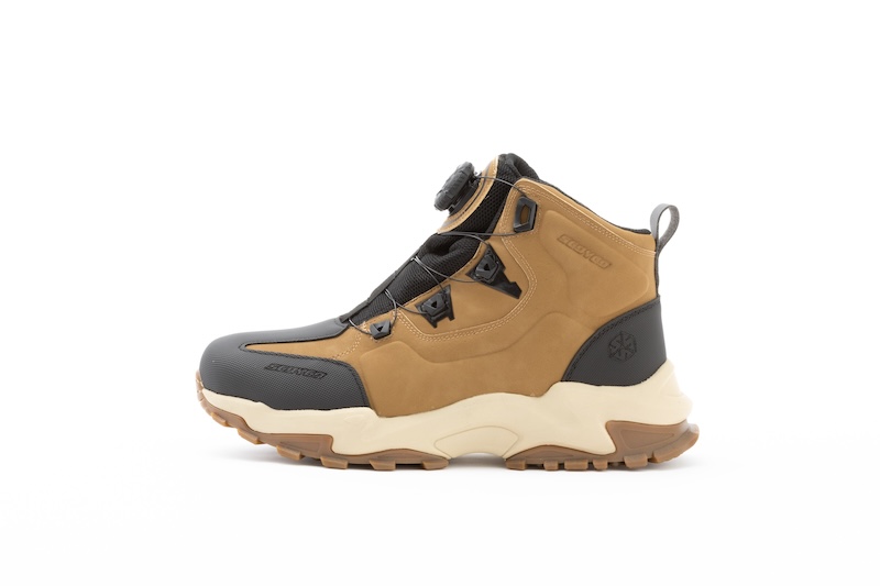シューレースは脱ぎ履き容易なダイヤル式を採用。ダイヤルはオフロードタイヤのようなワイルドな形状となり、スポーツシューズに使われているよりも厚みがあります。