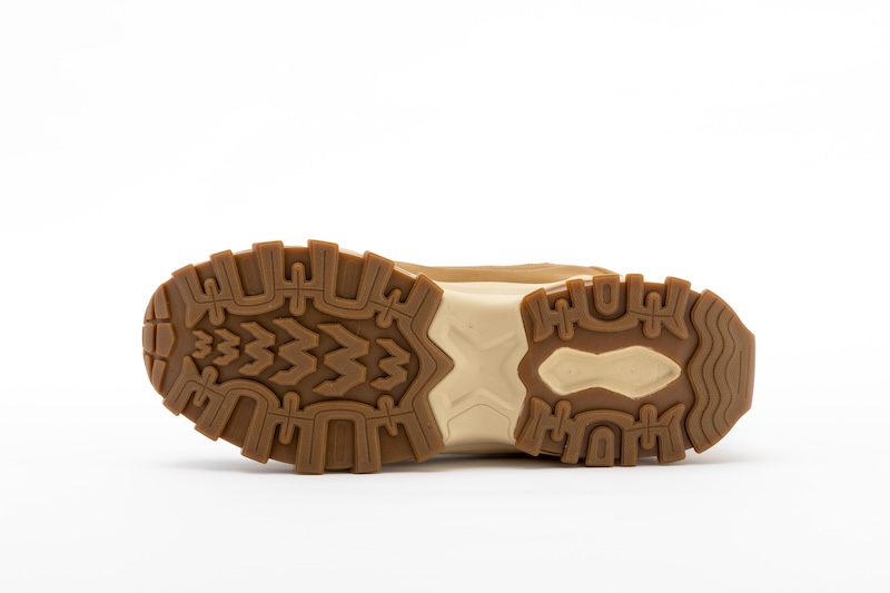 シューズのグリップ性を左右するアウトソールは凹凸の大きなラグソール。かかとの部分は大きく後ろまでカバーする形状で、デザイン上の大きなアクセントともなっています。