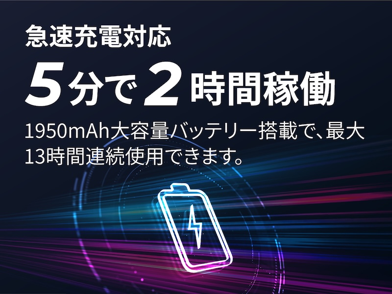1950mAhの大容量バッテリー搭載。急速充電対応で、5分の充電で2時間稼働。旅先の電池切れを防ぎます。