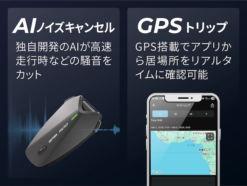 Reso独自開発のAIノイズキャンセルが高速走行時などの騒音をカット。アクションカメラとの音声連携も可能です。GPSトリップレコード機能により走行を開始すると位置情報を自動的に記録。GPSとジャイロセンサーによるSOS発信機能も搭載しています。