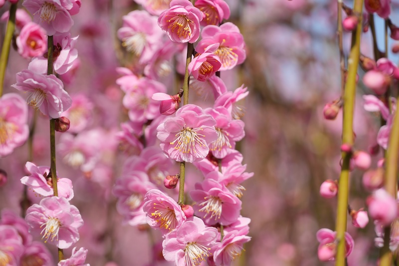 「鈴鹿の森庭園」では約200本の梅の名木が植栽されており、最も本数が多い「呉服しだれ」は2月26日の時点で七分咲きとなっています。連日の陽気により開花が進んでいる状況で、週末2月28日には見頃を迎えると予想されます。また、「八重月影しだれ」などすでに見頃を迎えている品種もあります。(同じ品種でも木によって咲き具合は若干の個体差があります)