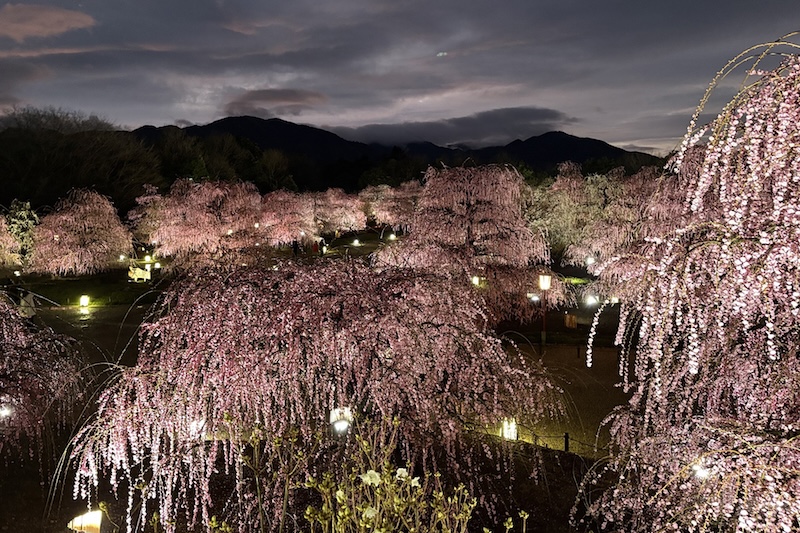 しだれ梅をやさしく照らすライトアップを2月25日から実施中です。黄昏時には鈴鹿山脈の稜線と紺碧の空を背景にしだれ梅が静かに浮かび上がり、やがて漆黒の闇の中でシャンデリアのように照らし出された花々が幽玄な世界を演出します。昼と夜とで全く違う様相を楽しめるのが本園の特徴です。