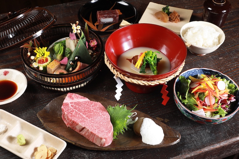 創業当時からの名物 福沸かしや旬な食材を堪能できる、梅まつり限定の御膳。メインは近江牛シャトーブリアンのステーキを。デザートに「あも 極」をご用意いたしました。