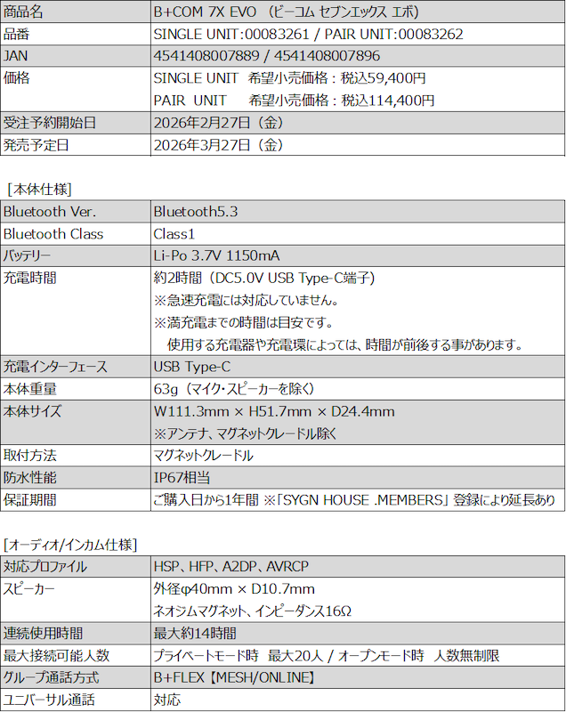 B+COM 7X EVO スペック表