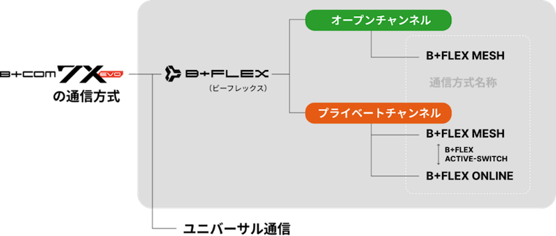 「B+COM 7X EVO(ビーコム セブンエックス エボ)」は、メッシュ通信とオンライン通信の2つの通信方式を採用した新開発の通信方式「B+FLEX」を搭載。「B+COM 7X EVO」では、この2つの通信方式を自動で最適な方式に切替えるハイブリッド型で、走行中に切替えを意識せずシームレスな通話ができます。