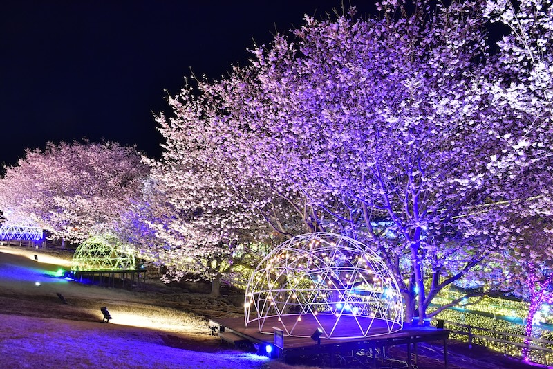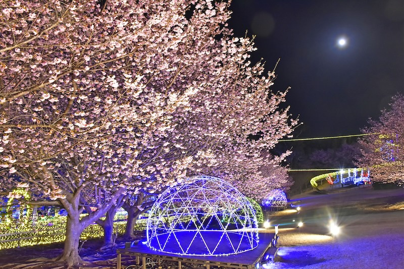 「城ケ崎桜」が満開になるころ園内では、日中は青空の下で桜を愛でながら芝生広場でゆったりと過ごし、夜はイルミネーションとライトアップされた桜の美しいコラボレーションをお楽しみいただけます。