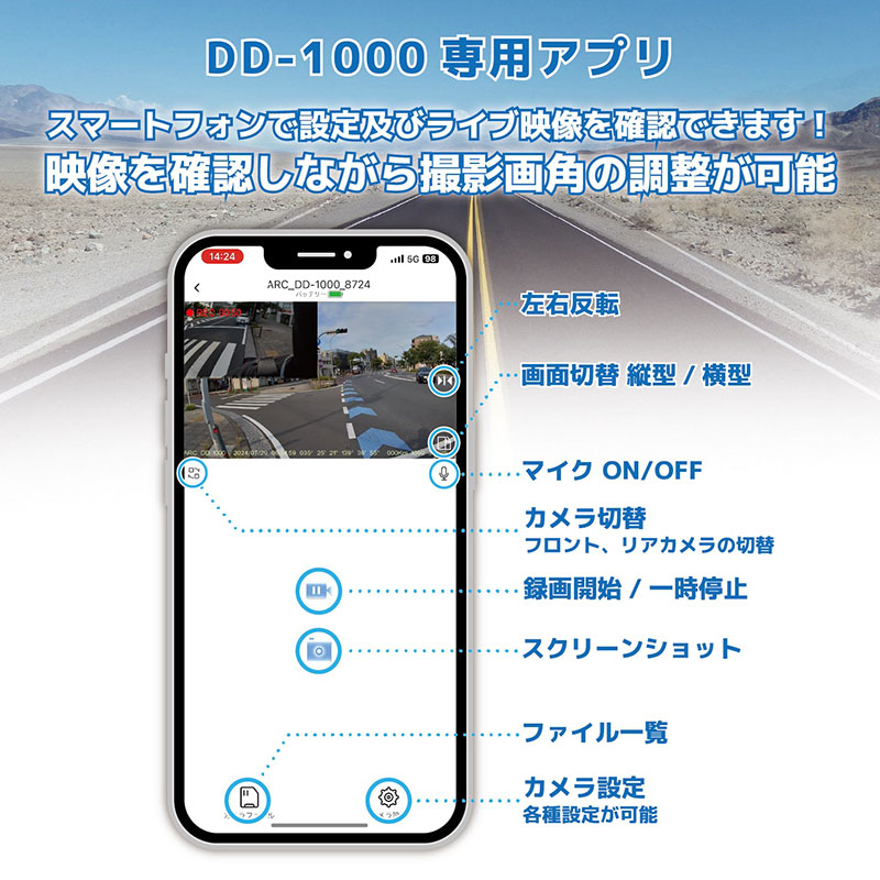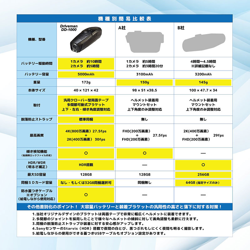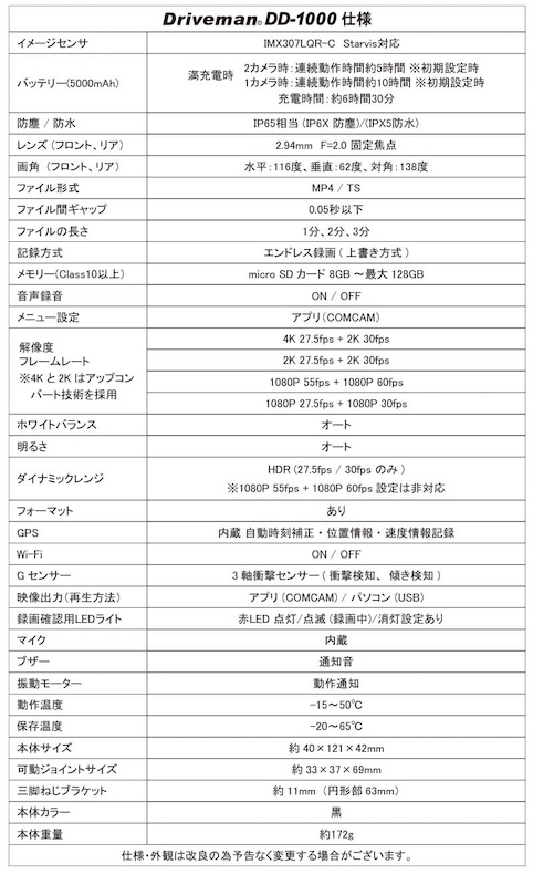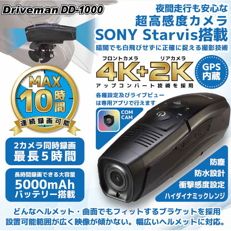 DD-1000は、前後同時撮影に対応した高性能バイク用ドライブレコーダーです。4K/2Kの高画質録画、Wi-Fi接続、ヘルメット装着対応など、ライダーの安全と快適さを追求した設計が特徴です。