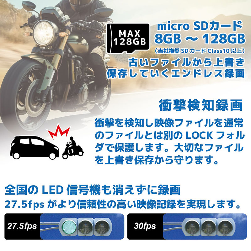 ・衝撃検知・ループ録画・音声記録など多機能搭載