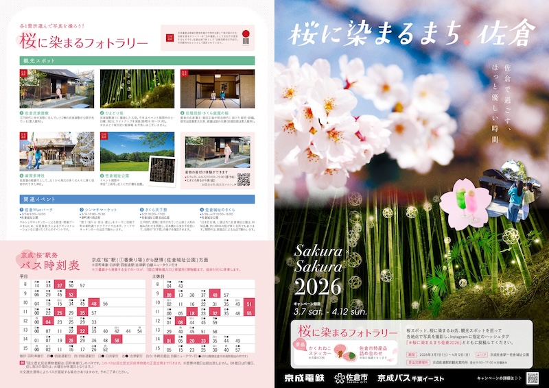 京成佐倉駅の駅名看板や、佐倉市役所・佐倉城址公園等の看板の「佐倉」の表記を「桜」に変更して、まち一体となり盛り上げるほか、城下町エリアの桜スポット・観光名所・飲食・お土産店を巡る「桜に染まるフォトラリー」を開催し、サムライの古径「ひよどり坂」の竹玉ライトアップや市立美術館での桜の体験型アート演出(インスタレーション)を行い、春気分を盛り上げます。