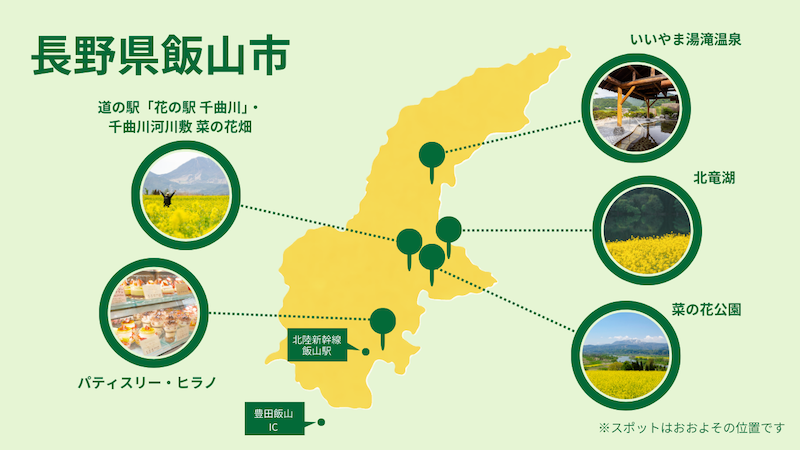 モデルコースでは、菜の花スポットに加え、飯山ならではの立ち寄り先もあわせて紹介しています。