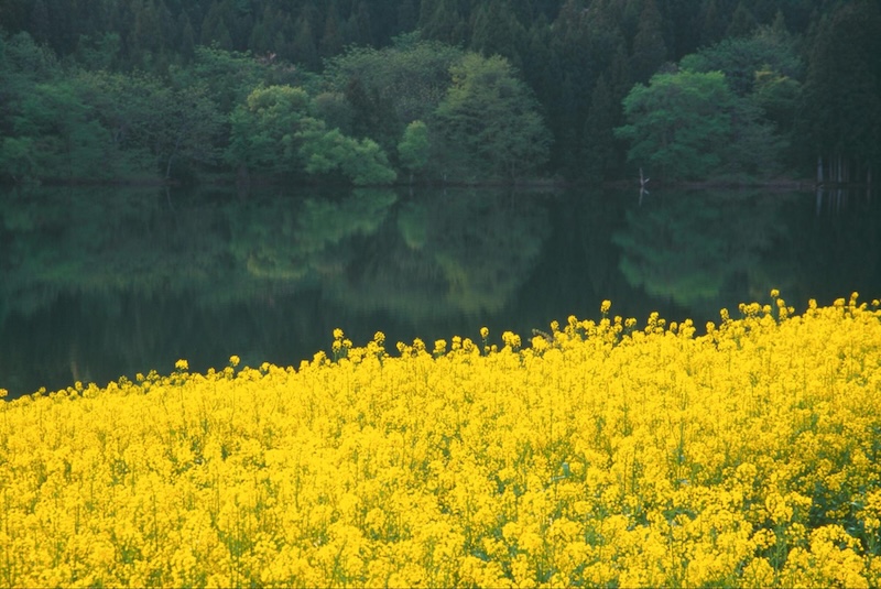 5月上旬〜中旬には湖畔に菜の花が咲き、春らしい風景が広がります。