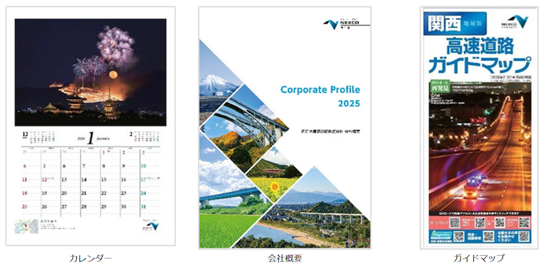 弊社カレンダー、「会社概要」冊子、SA等で配布する高速道路ガイドマップの表紙等の出版物やNEX