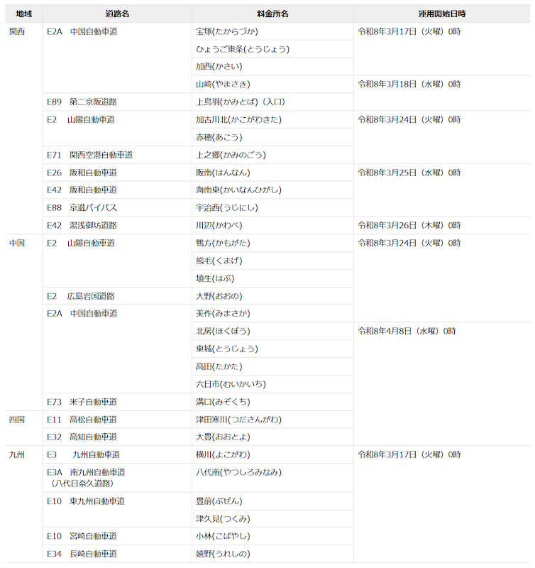 NEXCO西日本は、新たに30料金所をETC専用料金所として令和8年3月17日から4月8日の間で順次運用開始しますので、お知らせします。