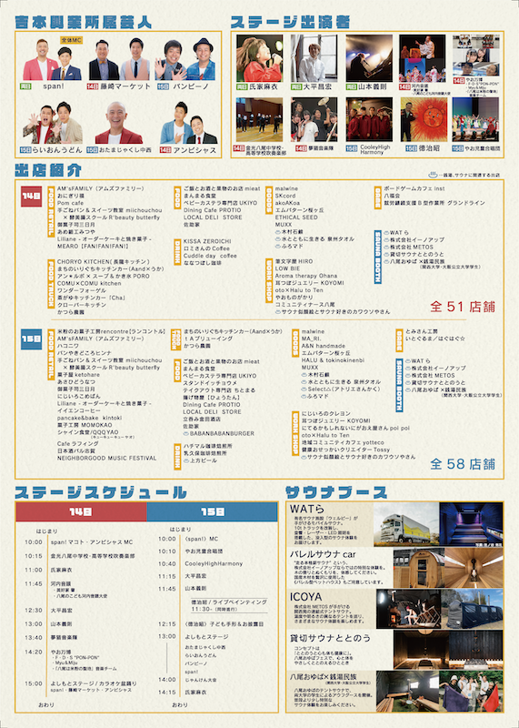 出演(予定):span!(総合MC)/藤崎マーケット(14日)/アンビシャス(14日)/バンビーノ(15日)/おたまじゃくし中西(15日)/らいおんうどん(15日)/かけおち(15日)ほか