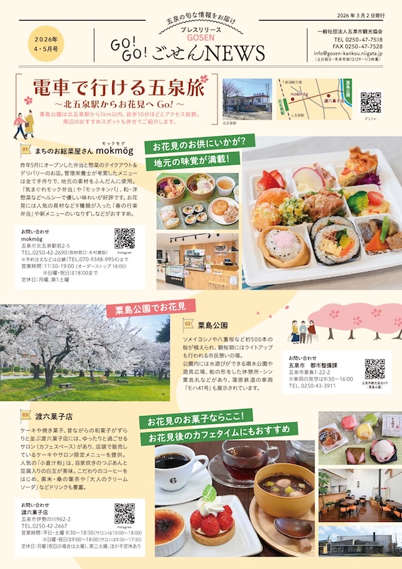 一般社団法人五泉市観光協会(新潟県五泉市)は、五泉市の旬な観光情報を発信する広報誌「GO!GO!ごせんNEWS」2026年4・5月号を発行しました。